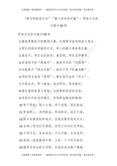 “根本职能是打仗”“最大使命是打赢”:军旅文化类过渡句50例[更多资源请百度搜索“培实素材网”]