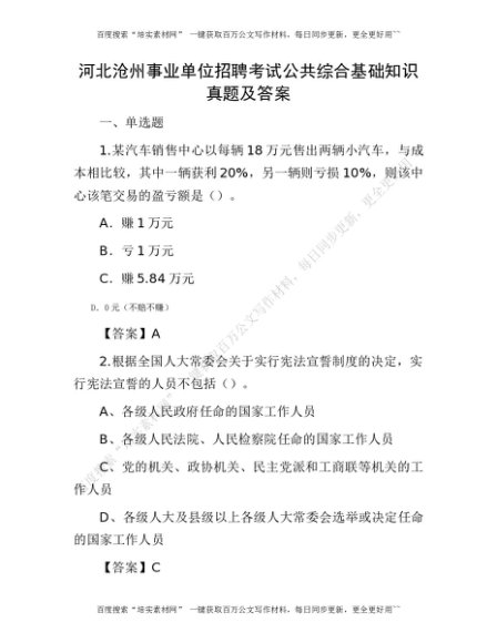 河北沧州事业单位招聘考试公共综合基础知识真题及答案[更多资源请百度搜索“培实素材网”]