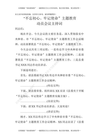 20190613不忘初心牢记使命主题教育动员会主持词[更多资源请百度搜索“培实素材网”]