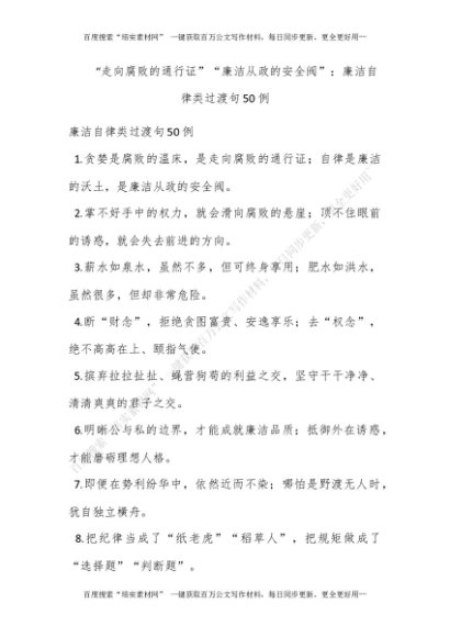 “走向腐败的通行证”“廉洁从政的安全阀”:廉洁自律类过渡句50例[更多资源请百度搜索“培实素材网”]