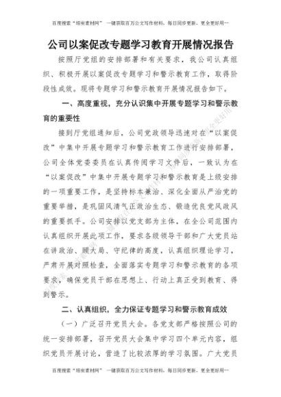 公司以案促改专题学习教育开展情况报告[更多资源请百度搜索“培实素材网”]