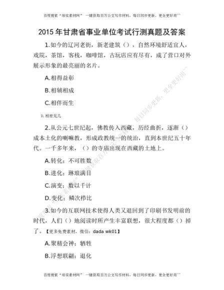 2015年甘肃省事业单位考试行测真题及答案(1)[更多资源请百度搜索“培实素材网”]