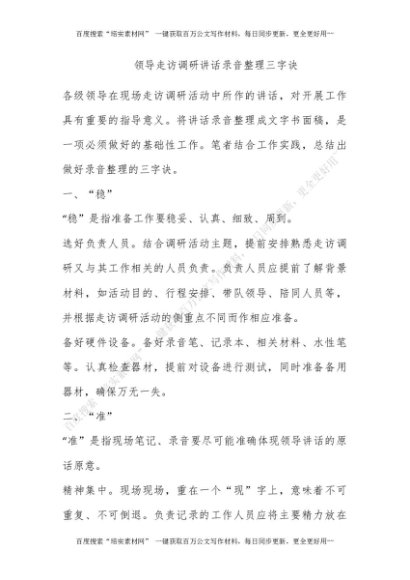 领导走访调研讲话录音整理三字诀[更多资源请百度搜索“培实素材网”]