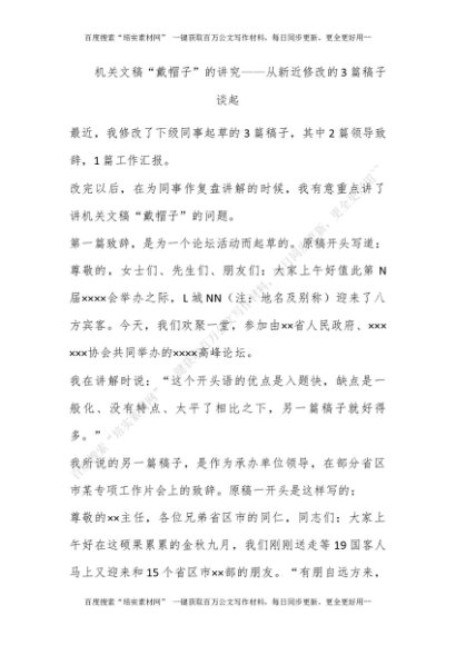 机关文稿“戴帽子”的讲究——从新近修改的3篇稿子谈起[更多资源请百度搜索“培实素材网”]