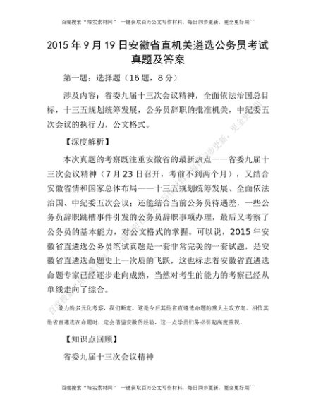 2015年9月19日安徽省直机关遴选公务员考试真题及答案[更多资源请百度搜索“培实素材网”]