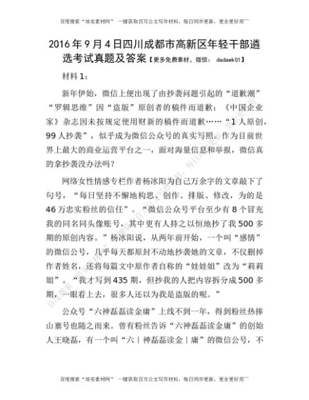 2016年9月4日四川成都市高新区年轻干部遴选考试真题及答案[更多资源请百度搜索“培实素材网”]