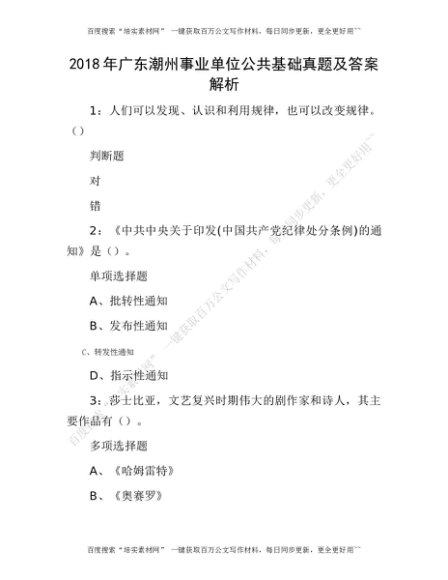 2018年广东潮州事业单位公共基础真题及答案解析(1)[更多资源请百度搜索“培实素材网”]
