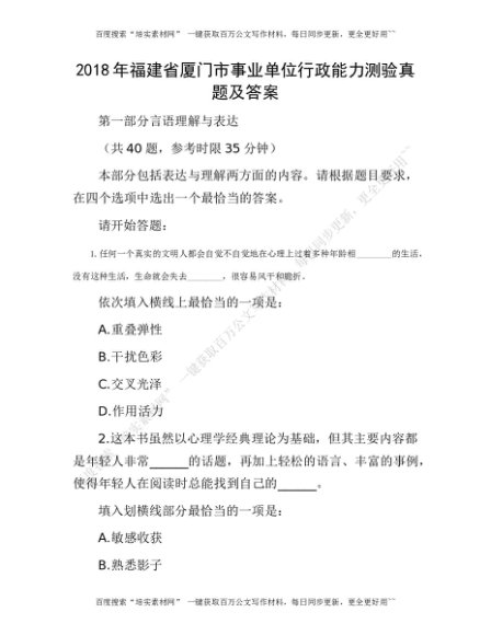 2018年福建省厦门市事业单位行政能力测验真题及答案(1)[更多资源请百度搜索“培实素材网”]