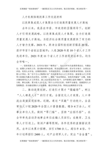 人才机制体制改革工作交流材料[更多资源请百度搜索“培实素材网”]